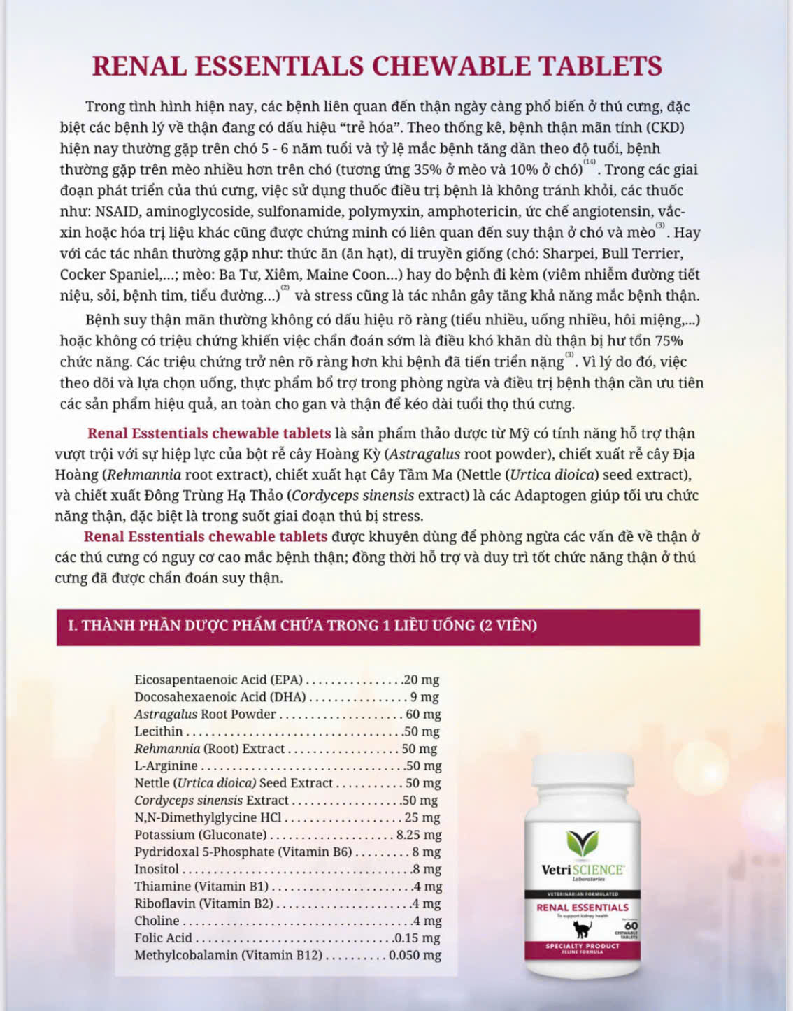 Viên uống Hỗ trợ Tiết niệu & Thận là sản phẩm bổ sung giúp hỗ trợ thận toàn diện. Sản phẩm có chứa các thành phần giúp tối ưu hóa sức khỏe và chức năng của thận; thích hợp sử dụng cho chó và mèo lớn tuổi (chó mèo già) hoặc chó mèo không được cung cấp hay uống đủ nước, đặc biệt là chó mèo gặp các vấn đề về thận và/hoặc cần tăng cường chức năng thận.