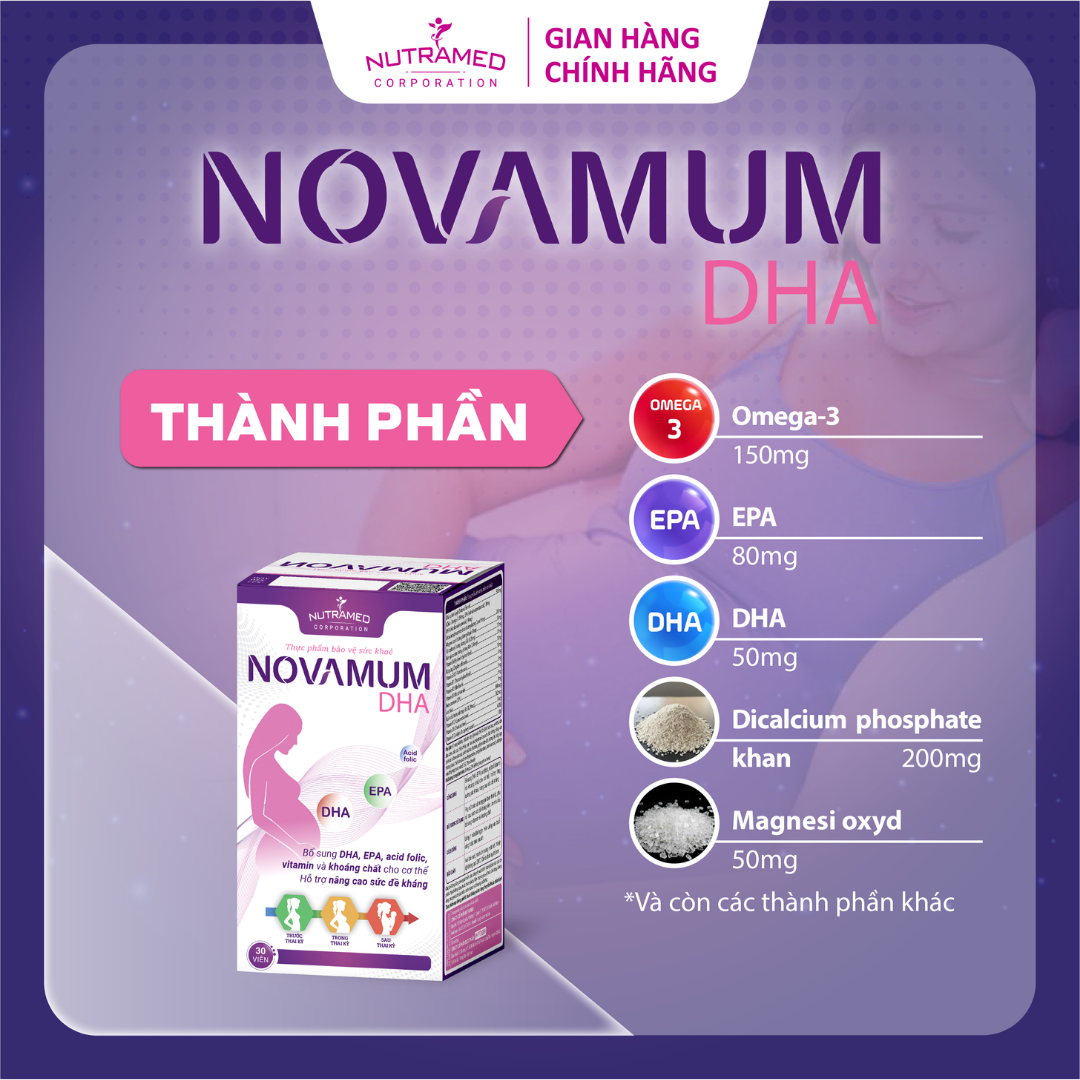 NOVAMUM DHA - Giải pháp bổ sung DHA, EPA, Acid Folic, Vitamin, Khoáng chất và hỗ trợ nâng cao sức đề kháng THÀNH PHẦN ️ Dầu cá tinh luyện, Dicalcium phosphate khan, Magnesi oxyd, Sắt carbonyl, Kẽm gluconate Vitamin B6 Bột gừng, Vitamin B5, Vitamin B1, Vitamin B2, Vitamin B3, Beta-carotene, Acid folic, Kali iodid, Vitamin B12, Vitamin D3, Vitamin E (DL-alpha tocopheryl)   CÔNG DỤNG ️ Bổ sung DHA, EPA, acid folic, một số vitamin và khoáng chất cho cơ thể, hỗ trợ nâng cao sức đề kháng.   ĐỐI TƯỢNG SỬ DỤNG ️ Phụ nữ trước và trong giai đoạn thai kỳ, phụ nữ sau sinh sức đề kháng kém, có nhu cầu bổ sung vitamin và khoáng chất.     HƯỚNG DẪN SỬ DỤNG ️ Uống 1 viên/lần/ngày. Nên uống vào buổi sáng hoặc trưa sau ăn.   KHÔNG SỬ DỤNG TRONG TRƯỜNG HỢP ️ Người mẫn cảm, kiêng kỵ với bất kỳ thành phần nào của sản phẩm.   LƯU Ý ️ Không dùng chung với các sản phẩm chứa vitamin và khoáng chất khác.  ️ Người đang dùng thuốc tham khảo ý kiến chuyên gia y tế trước khi dùng.  ️ Thực phẩm này không phải là thuốc, không có tác dụng thay thế thuốc chữa bệnh.   BẢO QUẢN  ️ Nơi khô mát, nhiệt độ không quá 30∘C, tránh ánh sáng mặt trời. Để xa tầm tay trẻ em.   THÔNG TIN SẢN PHẨM Tên sản phẩm: NOVAMUM DHA Quy cách: Hộp 3 vỉ x 10 viên Hạn sử dụng: 36 tháng Tiêu chuẩn: TCCS   _ NUTRAMED - KHƠI NGUỒN KHOA HỌC TỚI CUỘC SỐNG   Nhà máy đạt chuẩn WHO – GMP. Nguyên liệu được kiểm tra chất lượng khắt khe bởi nhà máy đạt chuẩn GMP.