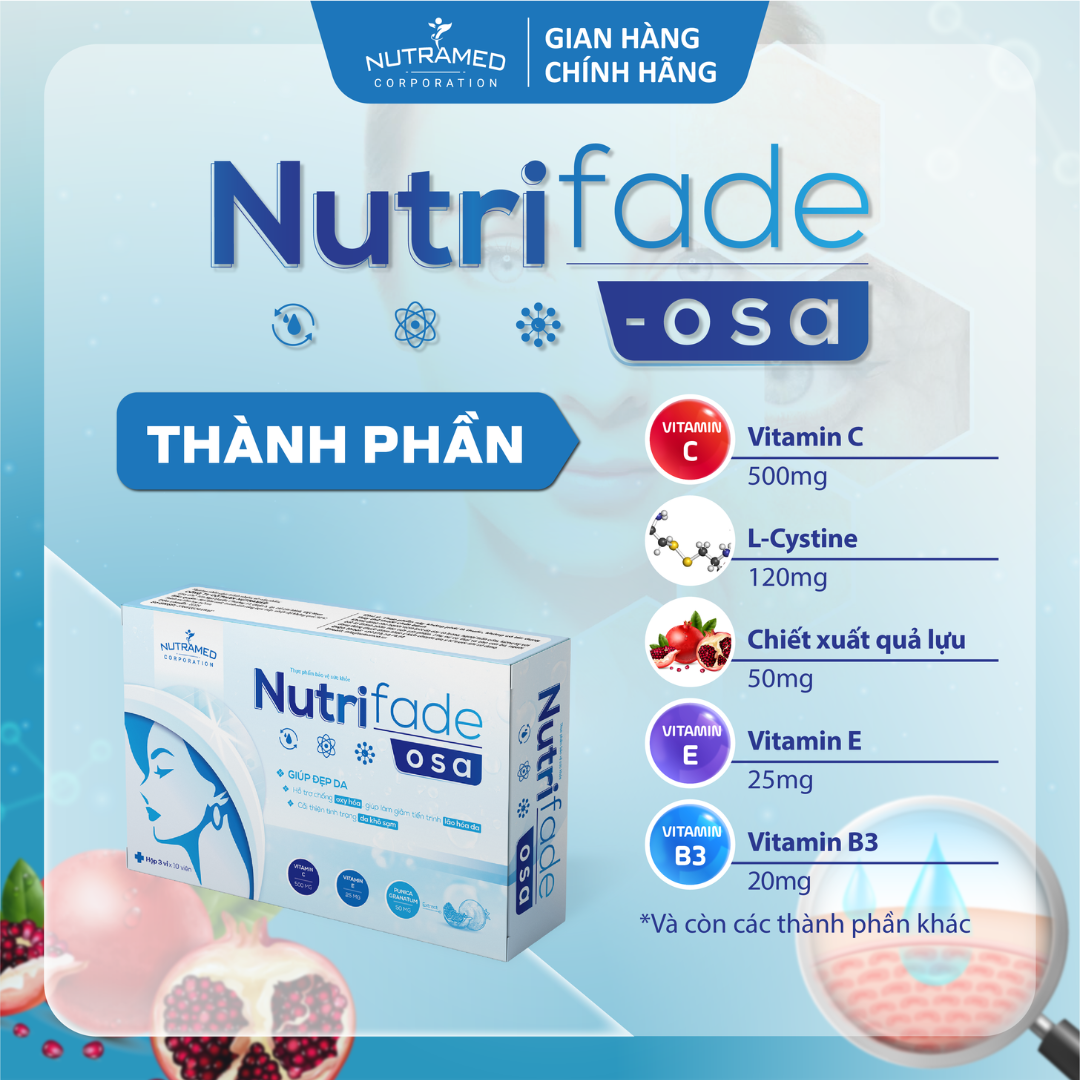 NUTRIFADE-OSA - Giải pháp hỗ trợ chống oxy hóa, giảm tiến trình lão hóa da, cải thiện da khô sạm, giúp đẹp da THÀNH PHẦN ️ Vitamin C (Ascorbic acid); L-Cystine; Chiết xuất quả lựu