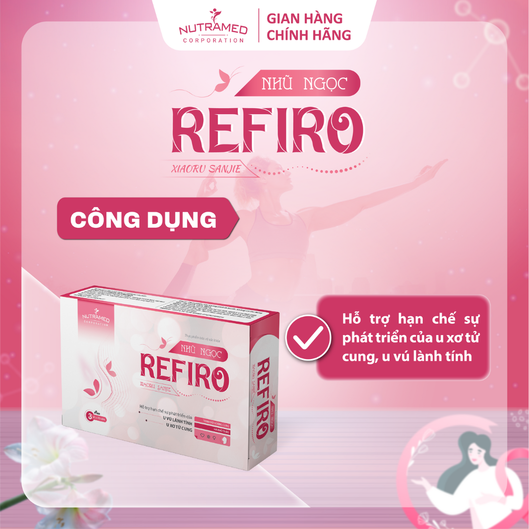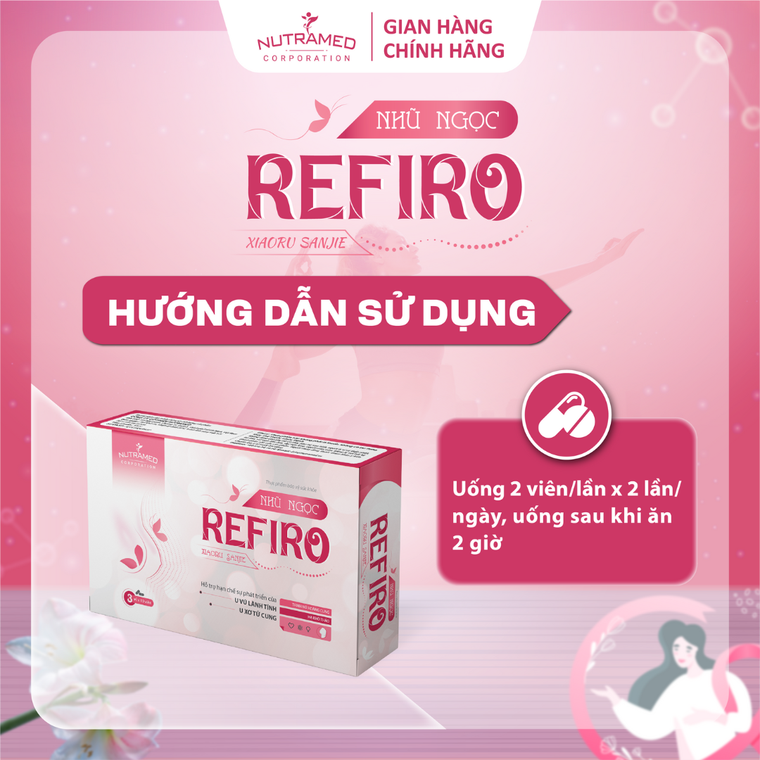 REFIRO - Hỗ trợ hạn chế sự phát triển của u xơ tử cung, u vú lành tính   THÀNH PHẦN ️Trinh nữ hoàng cung, Côn bố, Huyền sâm, Hạ khô thảo, Sài hồ, Đan sâm, Mao lương, Mẫu đơn bì, Hương phụ, Đương quy, Qua lâu, Hoàng cầm, Xuyên bối mẫu, Trinh nữ châu âu, Bạch thược   CÔNG DỤNG ️Hỗ trợ hạn chế sự phát triển của u xơ tử cung, u vú lành tính   ĐỐI TƯỢNG SỬ DỤNG ️Nữ giới trưởng thành bị u xơ tử cung, u vú lành tính     HƯỚNG DẪN SỬ DỤNG ️Uống 2 viên/lần x 2 lần/ngày, uống sau khi ăn 2 giờ   KHÔNG SỬ DỤNG TRONG TRƯỜNG HỢP ️Phụ nữ có thai, phụ nữ sau sinh. ️Người tì vị có thấp nhiệt, hư hàn, rối loạn tiêu hóa, đại tiện lỏng. ️Người mẫn cảm, kiêng kị với bất kỳ thành phần nào của sản phẩm.   LƯU Ý ️Người đang dùng thuốc tham khảo ý kiến của chuyên gia y tế trước khi dùng. ️Thực phẩm này không phải là thuốc, không có tác dụng thay thế thuốc chữa bệnh.   BẢO QUẢN  ️Nơi khô mát, tránh ánh nắng trực tiếp. Nhiệt độ không quá 30°C. Tránh xa tầm tay trẻ nhỏ.   THÔNG TIN SẢN PHẨM Tên sản phẩm: Nhũ ngọc Refiro Quy cách: Hộp 3 vỉ x 10 viên Hạn sử dụng: 36 tháng Tiêu chuẩn: TCCS   _ NUTRAMED - KHƠI NGUỒN KHOA HỌC TỚI CUỘC SỐNG   Nhà máy đạt chuẩn WHO – GMP. Nguyên liệu được kiểm tra chất lượng khắt khe bởi nhà máy đạt chuẩn GMP