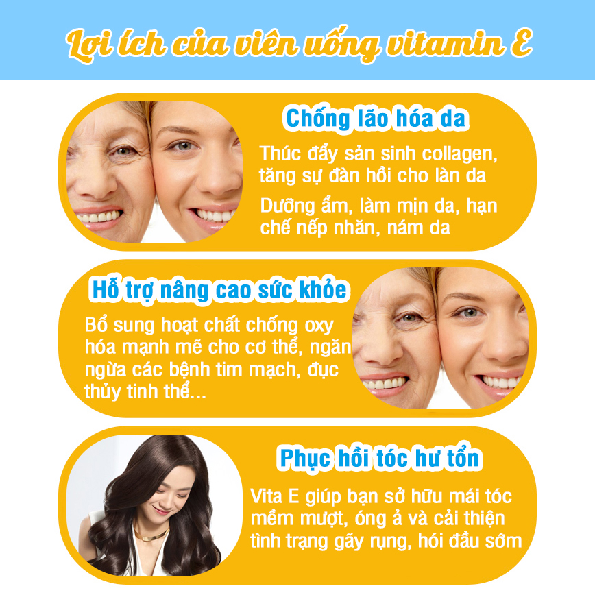 Công dụng: Bổ sung Vitamin E cho cơ thể, hỗ trợ giảm tình trạng thiếu vitamin E, Hỗ trợ chống oxy hoá, hạn chế lão hoá da, hỗ trợ làm đẹp da Đối tượng sử