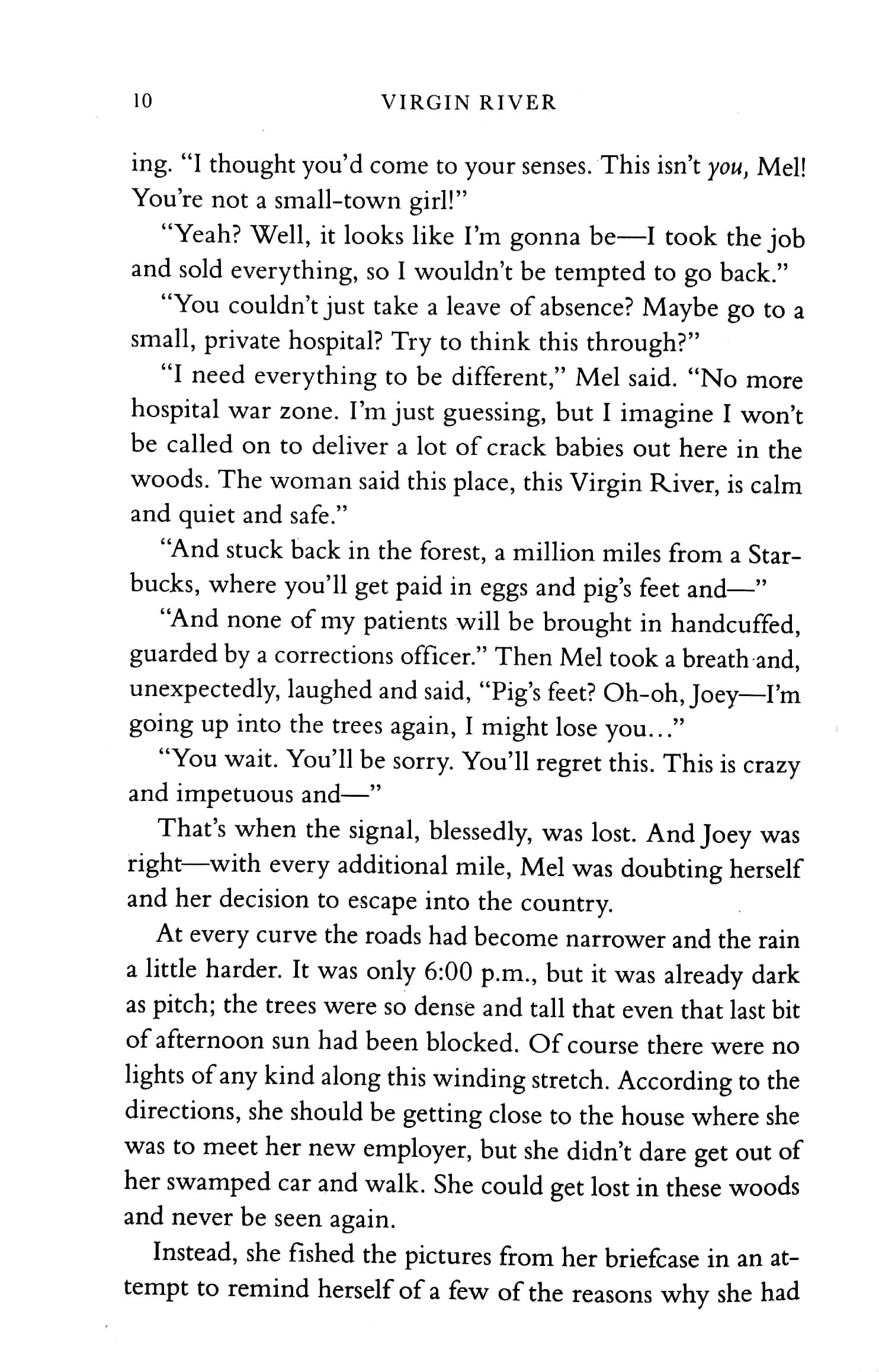 When the recently widowed Melinda Monroe sees this ad, she quickly decides that the remote mountain town of Virgin River might be the perfect place to escape her heartache and to reenergize the nursing career she loves. But her high hopes are dashed within an hour of arriving—the cabin is a dump, the roads are treacherous and the local doctor wants nothing to do with her. Realizing she's made a huge mistake, Mel decides to leave town the following morning.