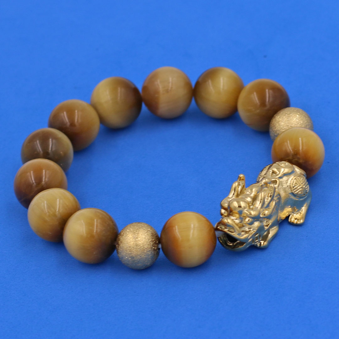 Thông tin sản phẩm : Vòng chuỗi đeo tay đá mắt hổ vàng 14 ly ( size lớn ) charm tỳ hưu và bi inox vàng, vòng tay chuỗi hạt