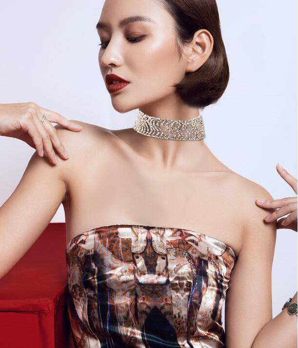 Vòng cổ bó sát 2 tầng lượn sóng chi tiết từng viên đá nhỏ tạo hiệu ứng ánh sáng lung linh, sang chảnh.