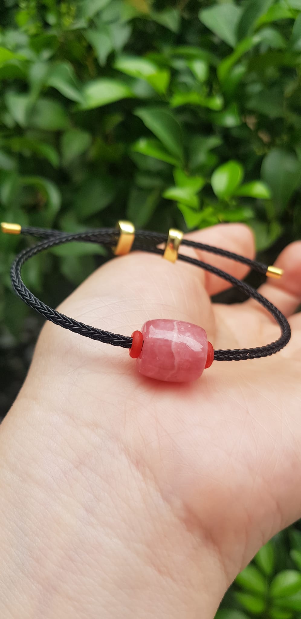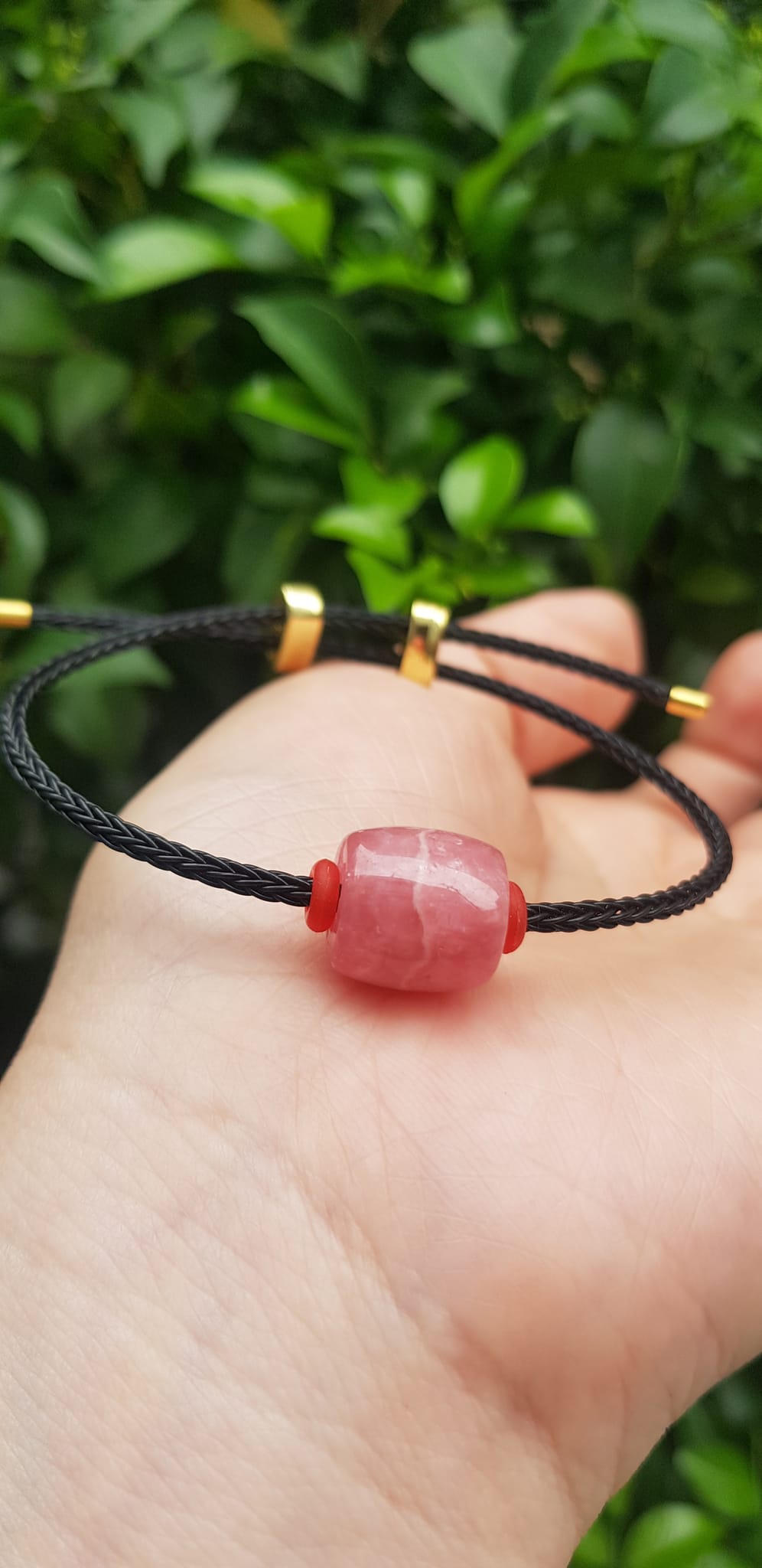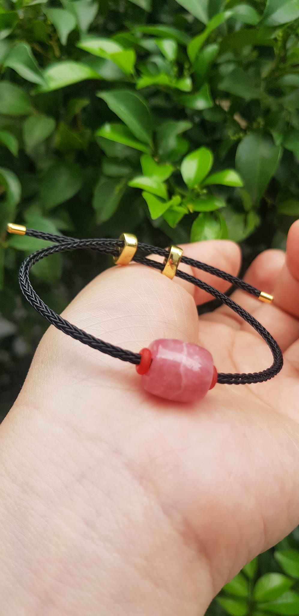 Vòng tay Charm Đá Đào Hoa hồng tươi tự nhiên bóng đẹp phối dây đen may mắn có khoen chỉnh theo tay lớn nhỏ được Nữ mệnh hỏa, mệnh thổ đeo xinh tay may mắn