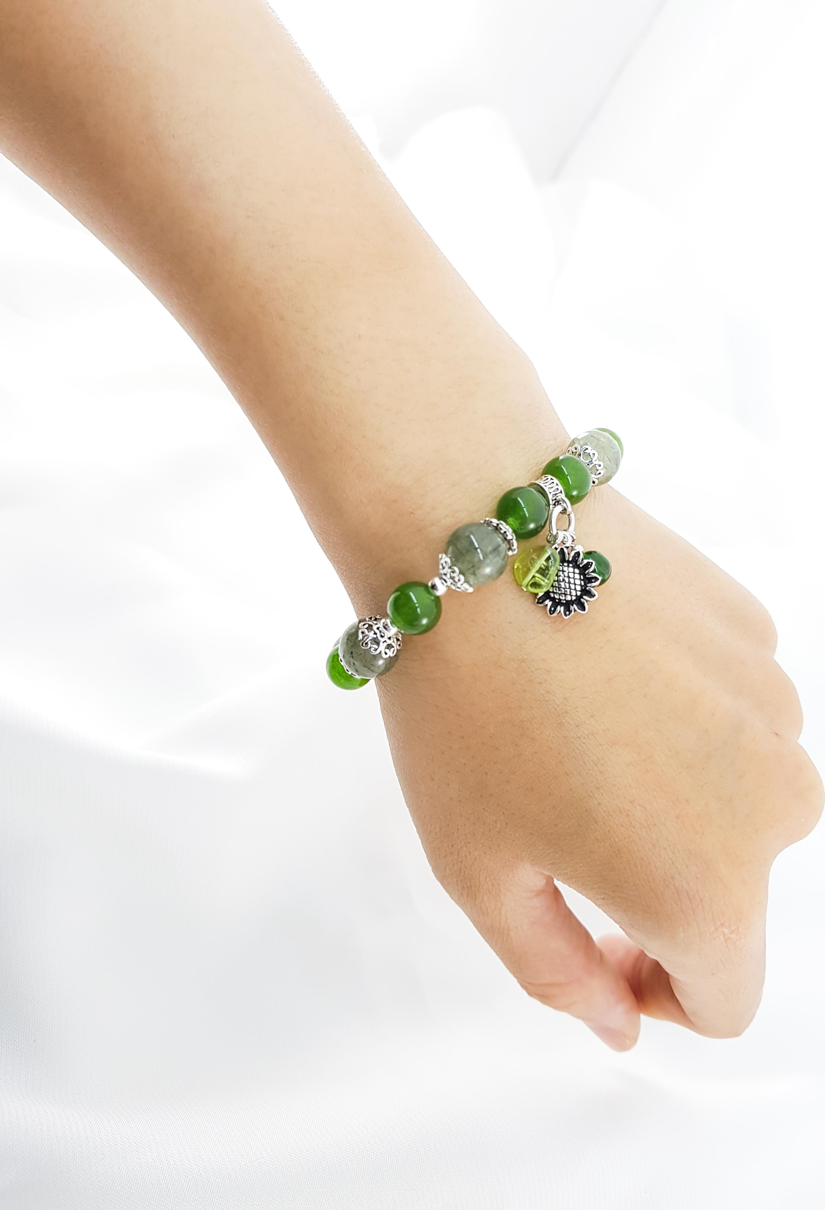 Vòng Thạch Anh Ưu Linh Xanh Phối Hoa Thạch anh xanh Đá Thạch Anh Xanh (Green Aventurine) còn được gọi là “Đá của Cơ Hội”, nó được cho là loại đá mang lại may mắn
