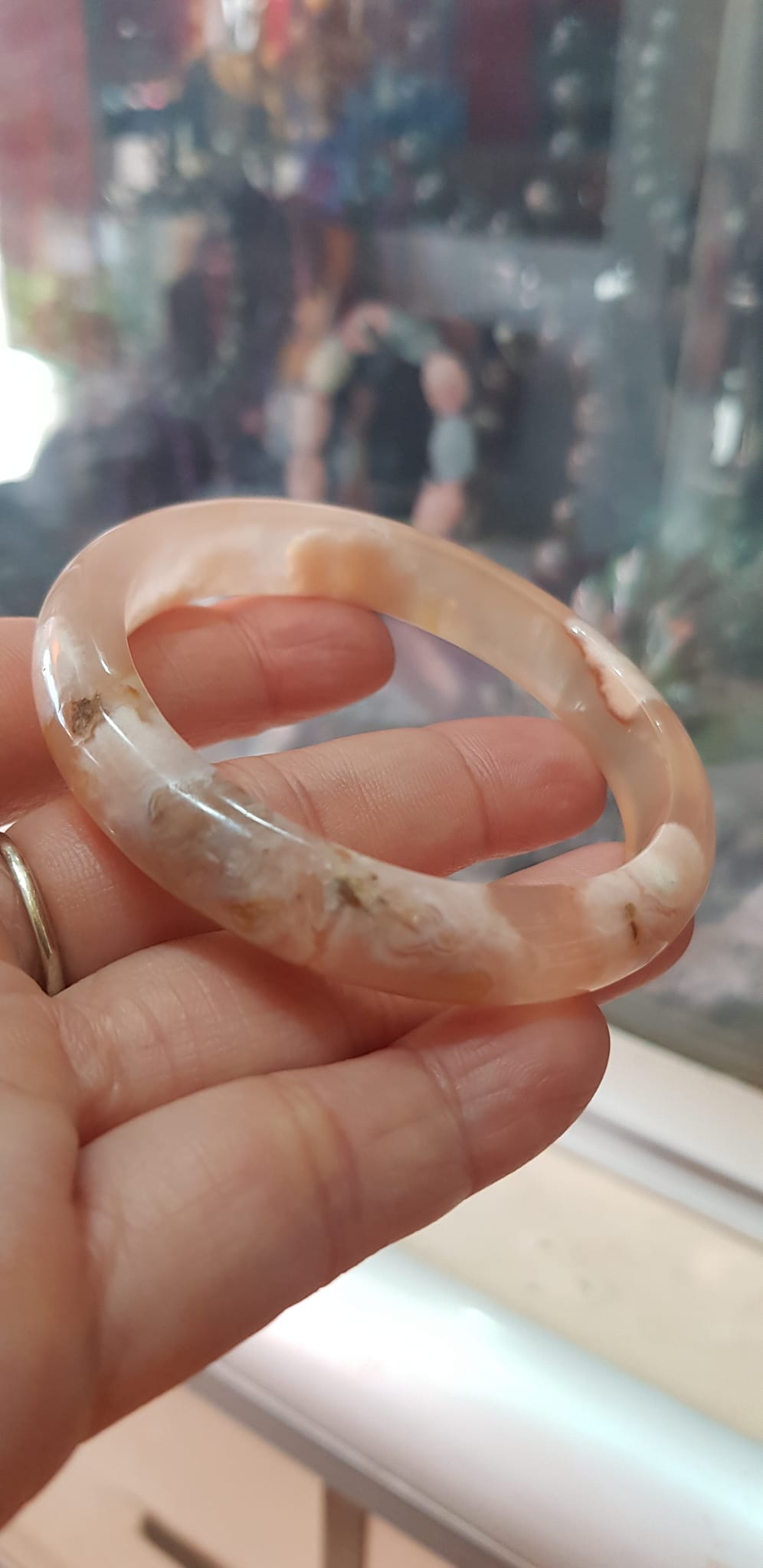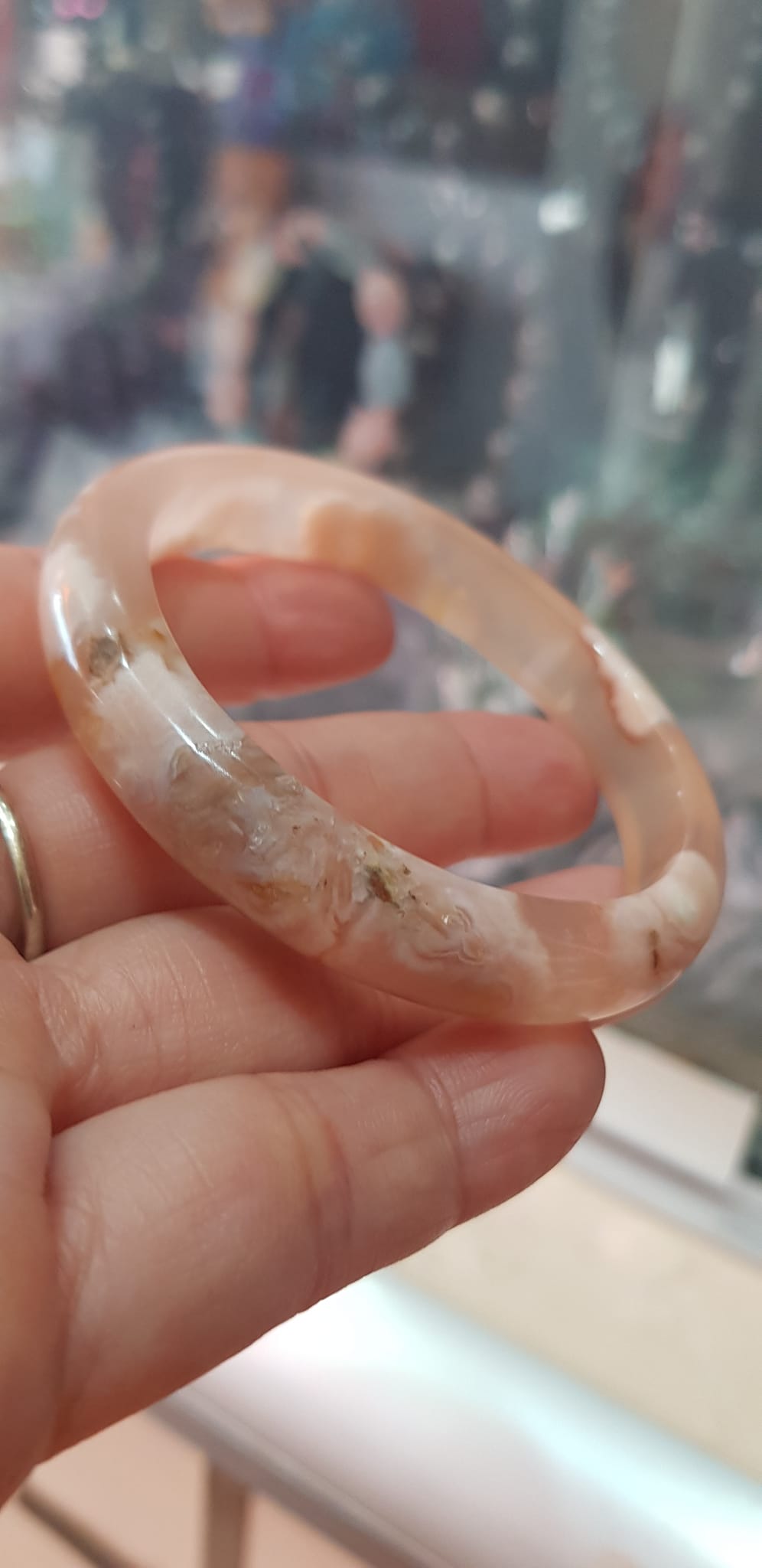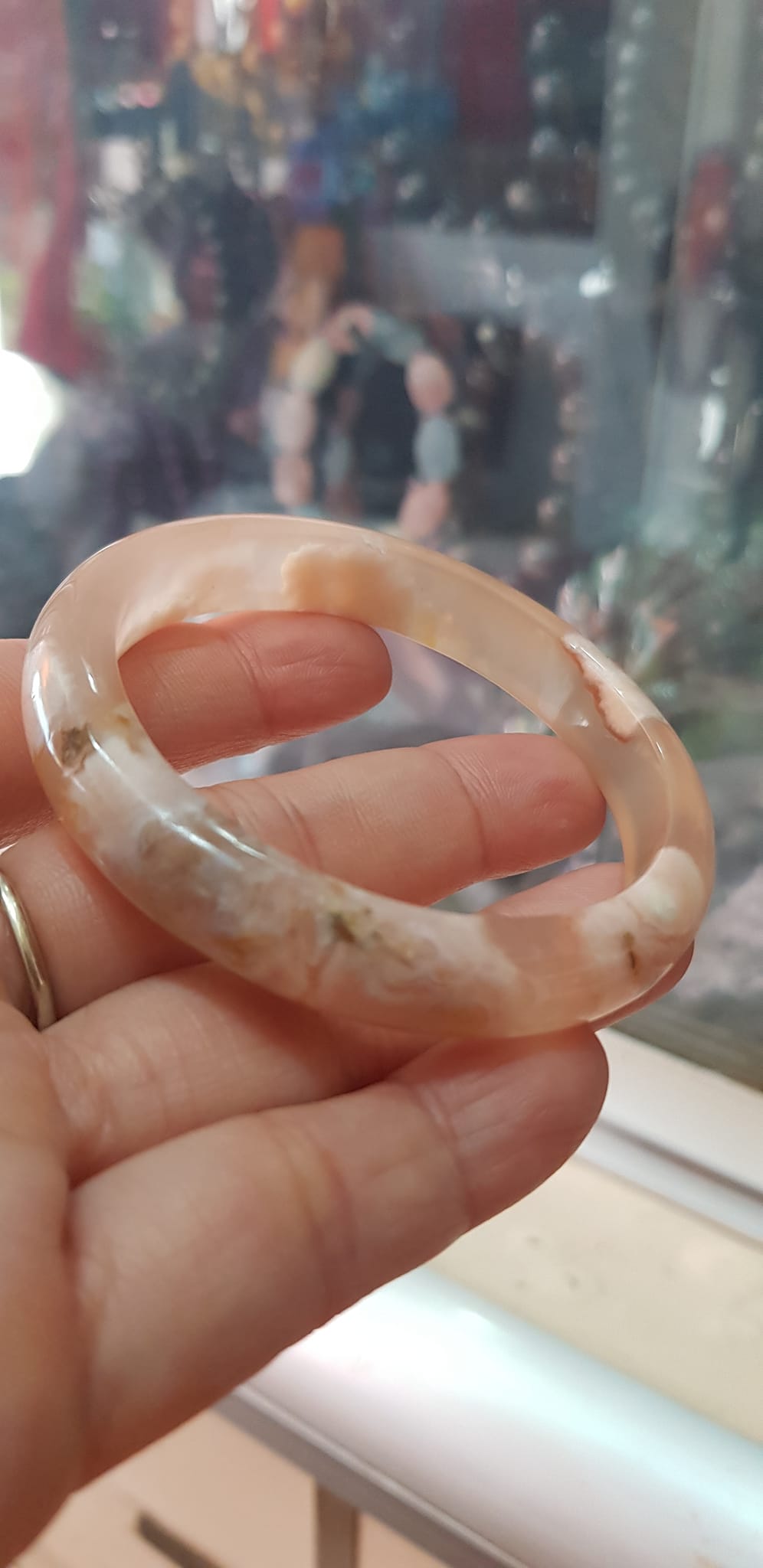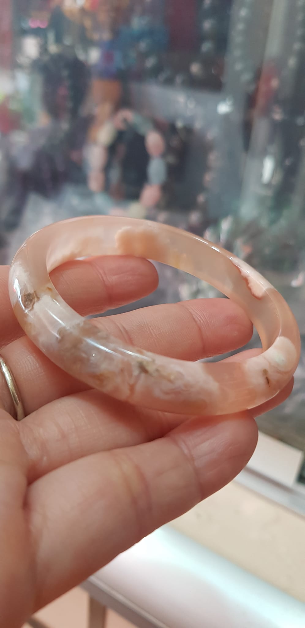 ✨Vòng tay Nữ Bản Hẹ Mới Đá Mã Não Bông Tuyết Hồng nhẹ trắng trong bóng quá đẹp luôn ạ Vòng Ni 53mm x Cao 11mm x dầy 7mm Nữ Cân nặng 52kg - 55kg đeo xinh tay đẹp lắm ạ
