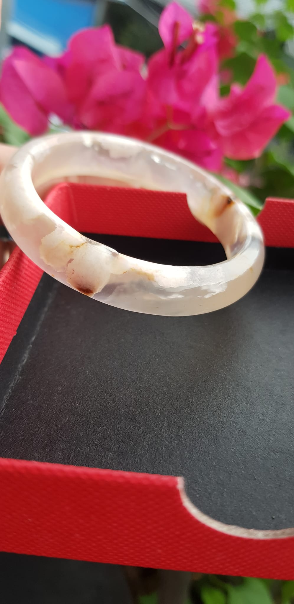 Vòng tay phong thuỷ Nữ Bản Hẹ Đá Mã Não trắng vàng nhẹ bông hoa bóng đẹp Vòng tay Nữ Ni 48mm x Cao 11mm x dầy 6mm Nữ tay nhỏ cân nặng 30kg -