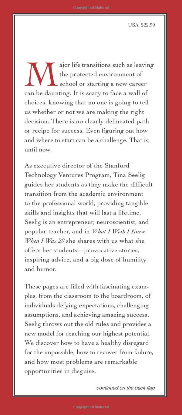 As executive director of the Stanford Technology Ventures Program, Tina Seelig guides her students as they make the difficult transition from the academic environment to the professional world, providing tangible skills and insights that will last a lifetime. Seelig is an entrepreneur, neuroscientist, and popular teacher, and in What I Wish I Knew When I Was 20 she shares with us what she offers her students—provocative stories, inspiring advice, and a big dose of humility and humor.
