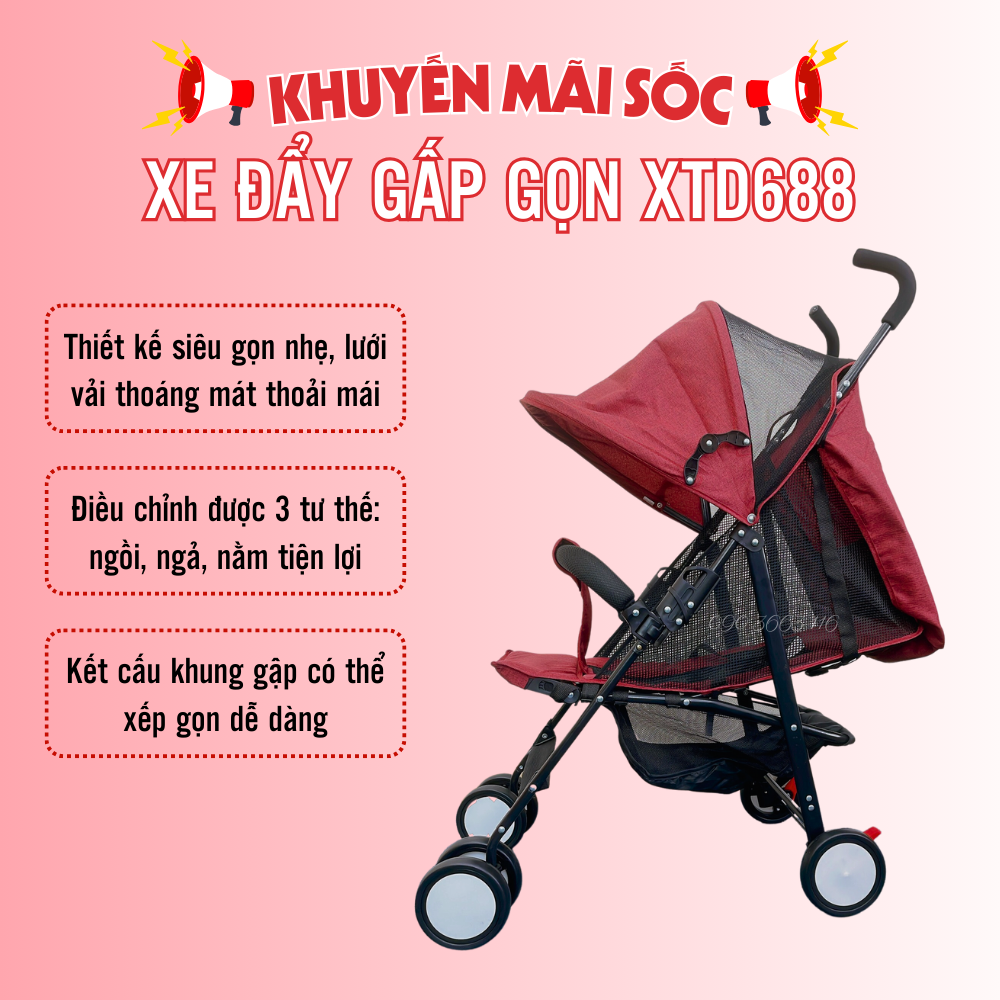 Giới thiệu Xe đẩy cho bé cao cấp VINANOI XD688 - Xe đẩy kéo du lịch gấp gọn siêu nhẹ, siêu thoáng, siêu bền lưới chống nắng cho bé 4 tháng 3 tuổi chăm sóc cho bé từ giấc ngủ êm ái, nhẹ nhàng, luyện cho bé các tư thế ngồi theo tháng tuổi, đến việc đưa bé đi dạo chơi công viên, giúp cho bé thoải mái trong mọi tư thế theo thời gian tháng tuổi, tiết kiệm thời gian và giảm chi phí cho bố mẹ