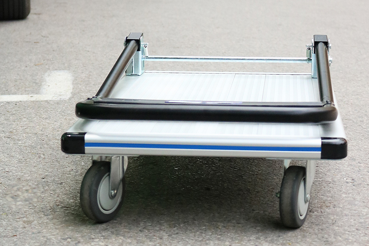 • Phần tay cầm bằng thép, có thể gấp gọn lại, vừa hỗ trợ đẩy hàng vừa tiết kiệm không gian khi cất giữ xe đẩy