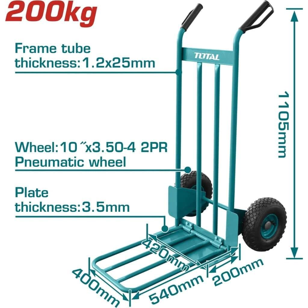 Thông số kĩ thuật -Mã sản phẩm: THTHT20771 -Nhà sản xuất: Total -Khả năng tải: 200kg. -Tay cầm bằng nhựa có độ bám caoL / H / W: 430 x 590 x 1105 mm. -Độ dày ống khung: 1,2 x 25mm. -Kích thước tấm lót chân: 420 x 200 mm -Kích thước tấm lót chân phụ: 540 x 400mm. -Độ dày tấm: 3,5 mm. Bánh xe: 10 "x 3,50-4 2PR (Bánh xe khí nén)