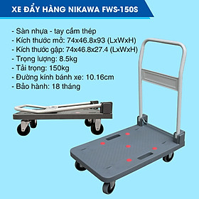 - Thông số kỹ thuật của Xe đẩy hàng, xe kéo hàng Nikawa FWS-150S, 4 bánh, tải trọng 150 kg -Kính thước mặt sàn: 74×46,8cm -Kích thước thu gọn: 74×46,8×27,4cm (L-W-H) -Kích thước mở: 74×46,8x93cm (L-W-H) -Kích thước bánh xe: 10,16cm -Trọng lượng xe đẩy: 8,5kg -Chất liệu: Sàn nhựa, tay cầm bằng thép -Tải trọng: 150kg