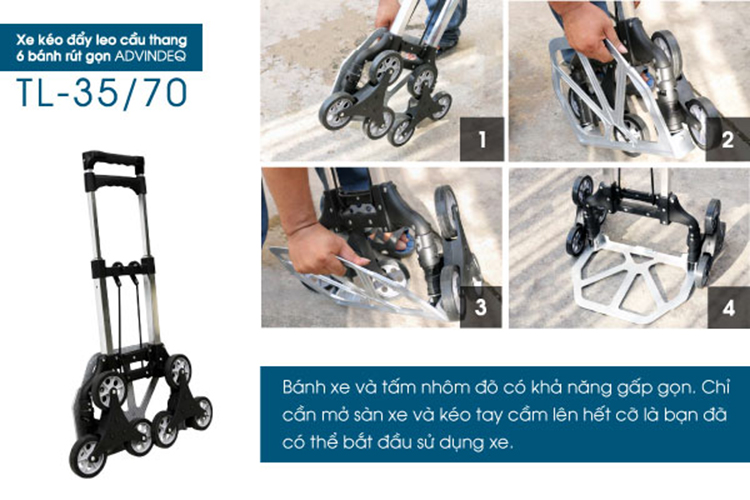 Mua tại TiktokTổng quan sản phẩm: Xe Kéo Đẩy Leo Cầu Thang 6 bánh rút gọn ADVINDEQ TL-35/70 trọng tải leo cầu thang 35 kg, đường bằng 70kg được làm bằng hợp kim nhôm có độ bền cao, trọng lượng xe 3.5kg cực nhẹ so với các sản phẩm xe đẩy hàng sắt thông thường trên thị trường. Xe kéo đẩy leo cầu thang 6 bánh rút gọn ADVINDEQ TL-35/70 Khung xe bằng khung nhôm định hình, giá đỡ hàng bằng gang đúc, giúp người lao động kéo hoặc đẩy hàng hóa dễ dàng hơn, an toàn hơn và năng suất hơn. Xe kéo hoặc đẩy hàng với khả năng di chuyển hàng hoá lên xuống cầu thang nhẹ nhàng tiện lợi, tải trọng khá lớn, đảm bảo đúng như công bố. Khung xe được làm bằng nhôm cao cấp, siêu bền Giá đỡ được đúc bằng gang, chịu được tải trọng Xe có tải trọng leo cầu thang 35kg, đi đường bằng 70kg, gồm có 6 bánh xe. Các ống được làm từ hợp kim nhôm rất chắc chắn, độ bền vượt bậc. Loại xe này có khả năng vượt dốc, leo cầu thang, thích nghi với mọi địa hình leo trèo. Công dụng: Xe được thiết kế thích nghi cho công việc hậu cần, dùng để vận chuyển tài liệu, hàng hóa trong các cơ quan, văn phòng, siêu thị, hộ gia đình, các nhà máy, xưởng sản xuất vừa và nhỏ,… Đặc biệt với thiết kế bánh xe to – mỗi bên 3 bánh (tổng 6 bánh xe) dùng vận chuyển trong các địa hình không bằng phẳng, đặc biệt là vận chuyển hàng hóa lên xuống cầu thang trong các tòa nhà cao tầng rất tiện lợi. Cấu tạo các bánh xe: Gồm 6 bánh thiết kế trên cùng 1 trục theo kiểu hình tam giác, mỗi bánh hoạt động theo phương thức độc lập. Một bánh làm trụ, bánh kia bám vào trên/dưới cầu thang, cứ thế các bánh xe hoạt động luân phiên nhau cho đến khi lên/xuống các bậc cầu thang còn lại. Một bánh làm giữ làm trụ Bánh kia bám vào bề mặt bậc cầu thang làm điểm tựa cho xe Các bánh xe hoạt động tuần hoàn cho đến khi nào đi hết các bậc cầu thang Dưới mỗi bánh xe thiết kế nhựa cao cấp có độ ma sát cao, bám rất chắc vào sàn nhà, sàn bậc cầu thang không bị trượt. Xe leo lên và đi xuống cầu thang một cách dễ dàng. Bánh xe có độ ma sát cao, khả năng bám vào mặt sàn cực chắc
