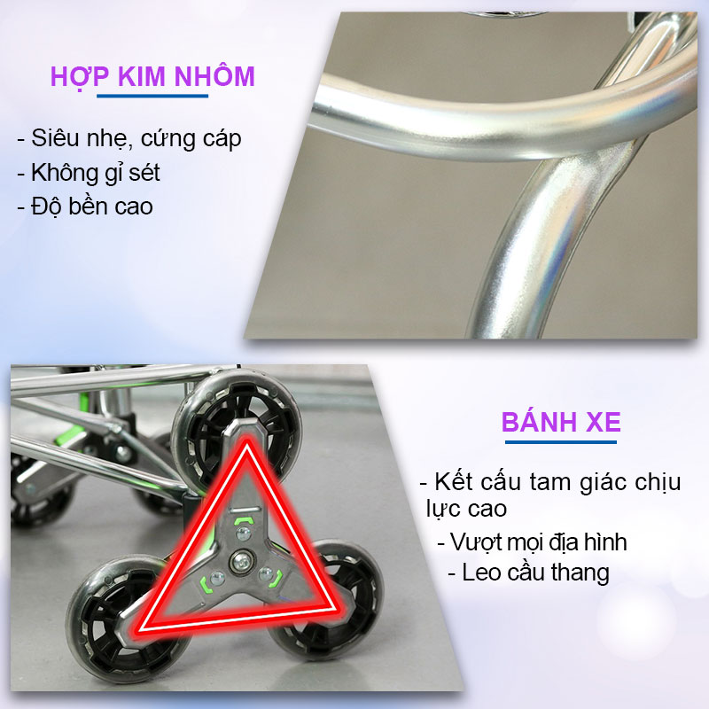 - Bộ bánh xe vật liệu nhựa dẻo cho khả năng chịu tải cao, hoạt động êm ái, thiết kế 3 bánh xe kiểu tam giác cân có thể leo cầu thang dễ dàng