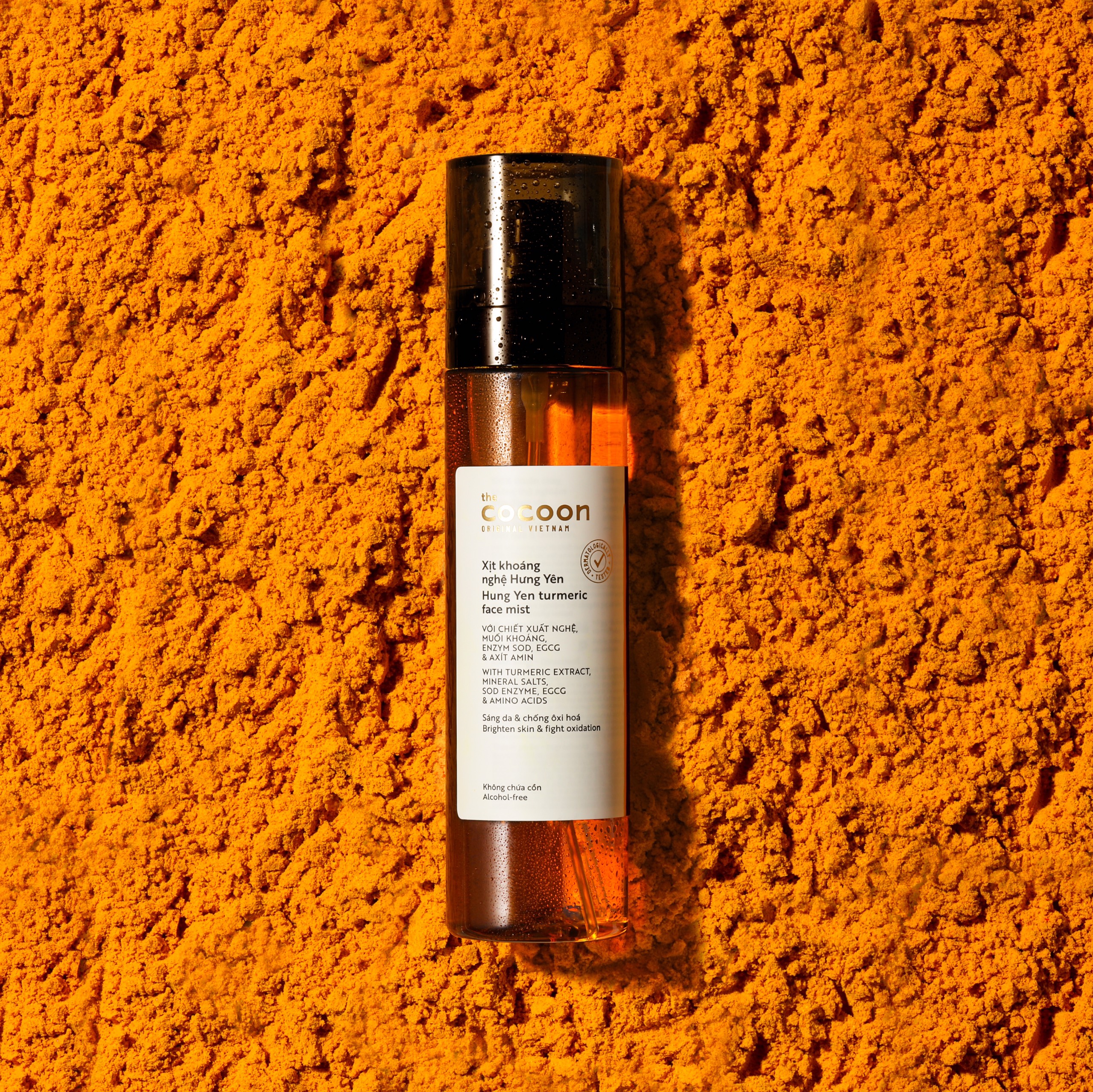 Mua tại TiktokMột lớp sương mịn từ chiết xuất củ nghệ, muối khoáng kết hợp cùng enzym SOD, EGCG và các axit amin sẽ bao phủ làn da giúp cấp ẩm tức thời, giúp làm sáng, chống oxi hóa mạnh mẽ và bảo vệ da khỏi các tác nhân gây hại từ môi trường. XỊT KHOÁNG NGHỆ HƯNG YÊN COCOON THUẦN CHAY KHÔNG VÀNG DA. Công dụng Xịt khoáng nghệ Hưng Yên cocoon