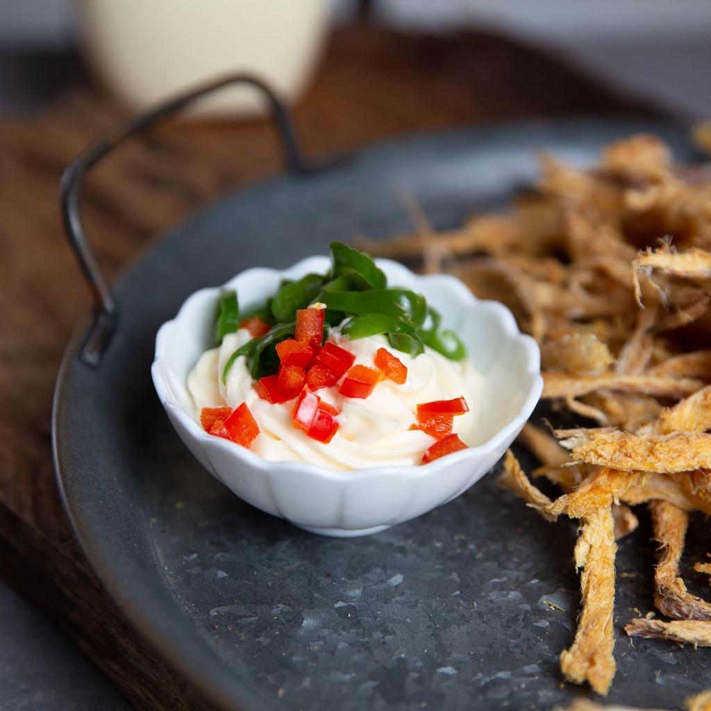 - Thành phần: Nước, dầu đậu nành, đường, dấm, muối, trứng, mù tạ – Là sản phẩm được kết hợp giữa công ty Cholimex Food nổi tiếng hơn 30 năm về sản xuất tương ớt