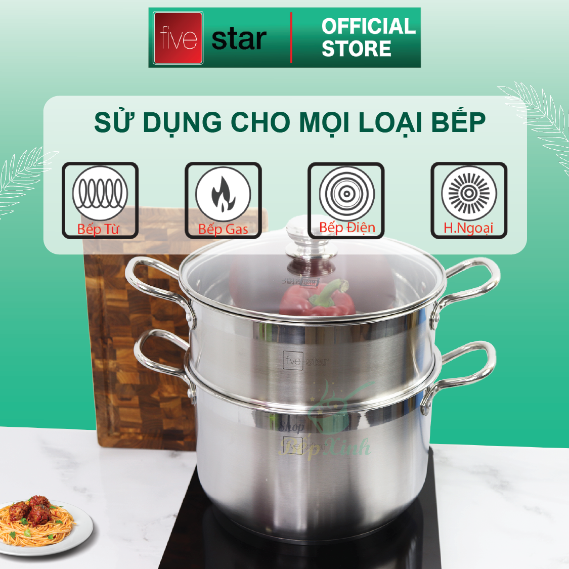 Bộ Nồi Xửng Hấp 26cm Inox 3 Đáy Fivestar Nắp Kính Dùng Bếp Từ